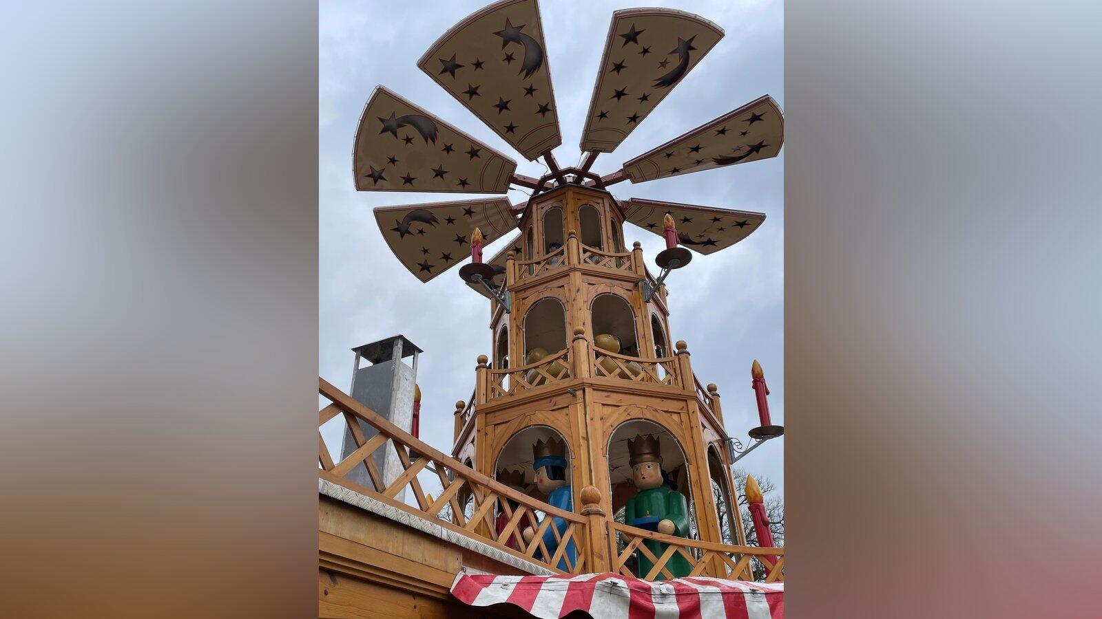 Die Kerze wurde samt Halterung im ersten Stock der Pyramide herausgebrochen. Von der weihnachtsschändlichen Tat zeugen nur noch Splitterspuren am Holz. Die Kerze ist weg.