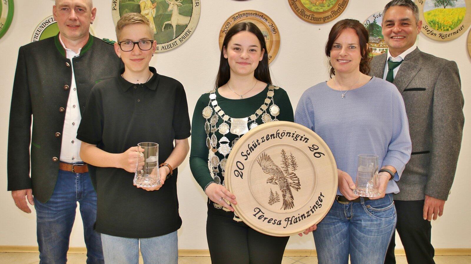Vize-Schützenmeister Markus Schaller, Jonas Bachmaier, Schützenkönigin Tesi Hainzinger, Tina Hainzinger und Sportleiter Bertl Hainzinger.