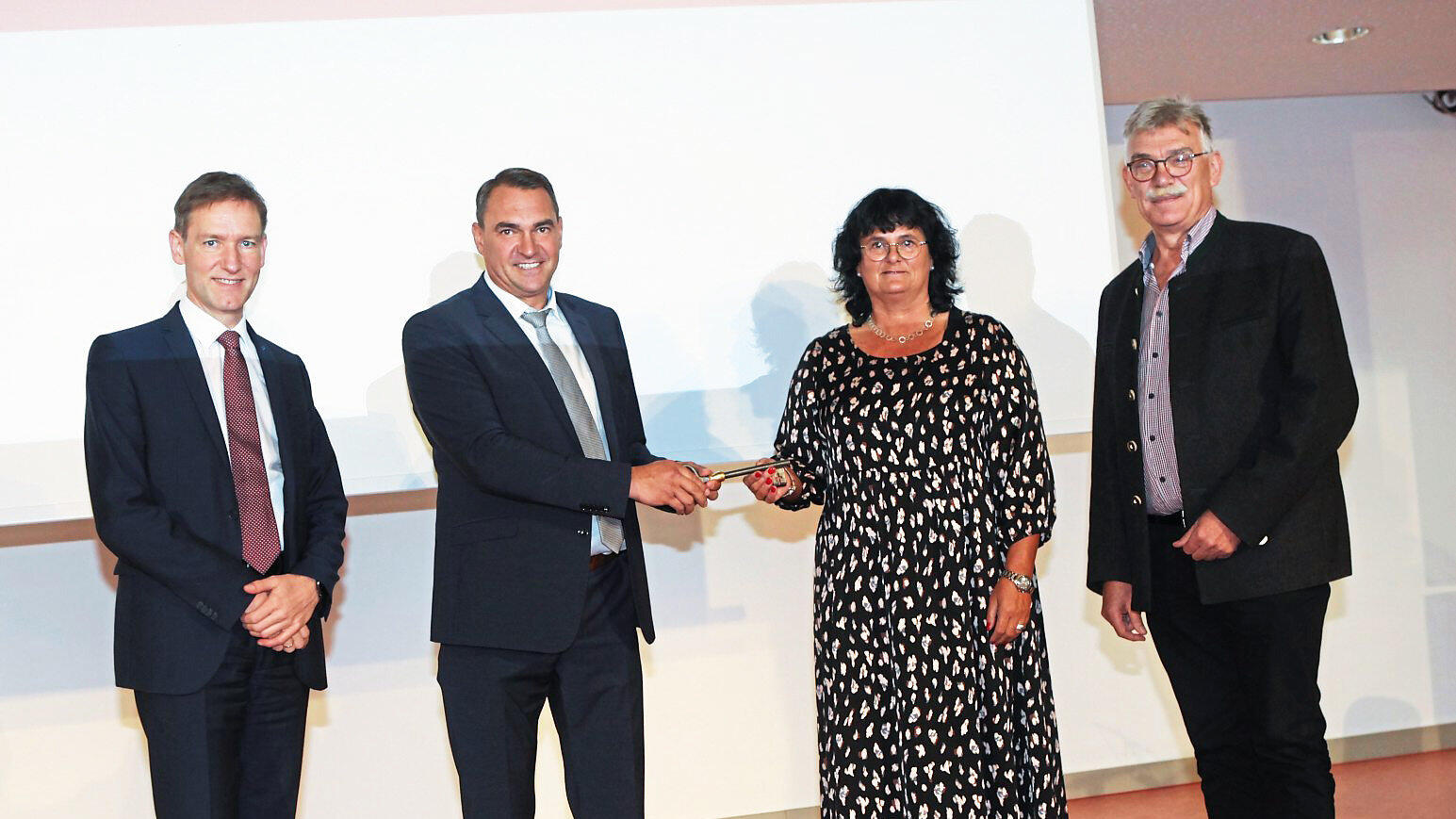 Symbolische Schlüsselübergabe von Bürgermeister Alfred Holzner an Konrektorin und kommissarische Schulleiterin Heidi Wargitsch. Regierungspräsident Rainer Haselbeck (l.) und Architekt Manfred Winkler gratulierten.