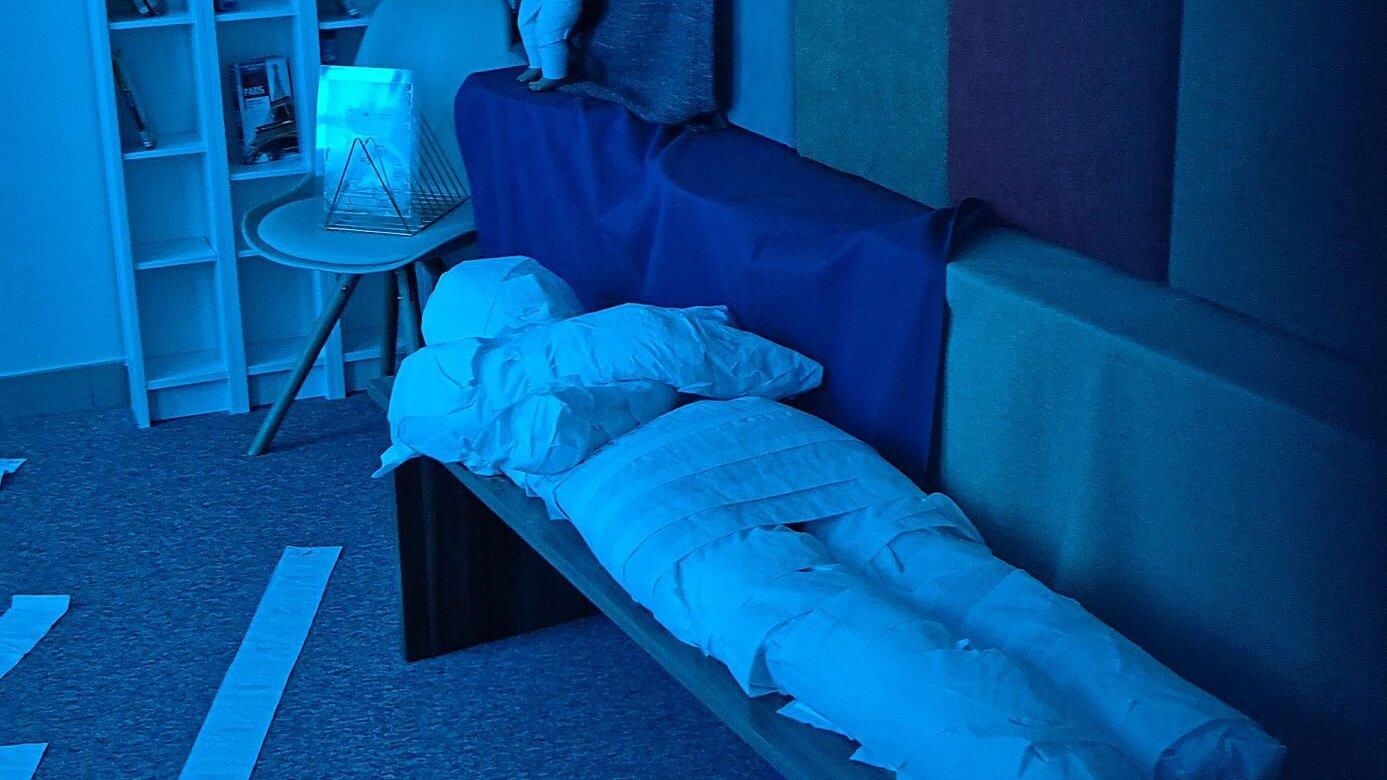 Der verkleidete Übungs-Dummie der Feuerwehr diente als Mumie im Escape Room der Bücherei.