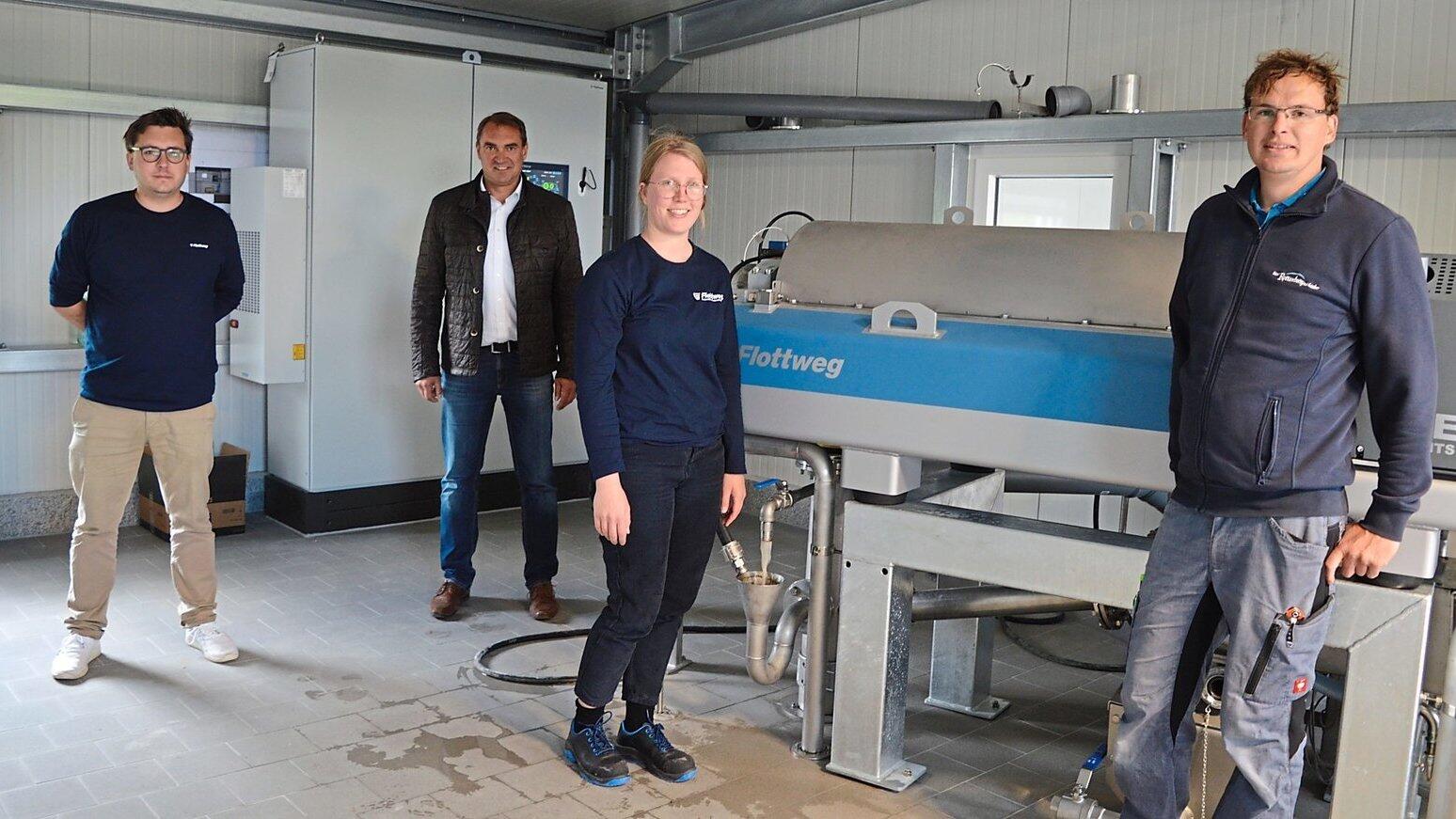 Julian Dirr von Flottweg, Bürgermeister Alfred Holzner, Hanna Ueffing von Flottweg und Abwassermeister Andreas Röhrdanz vor der neuen Zentrifuge.