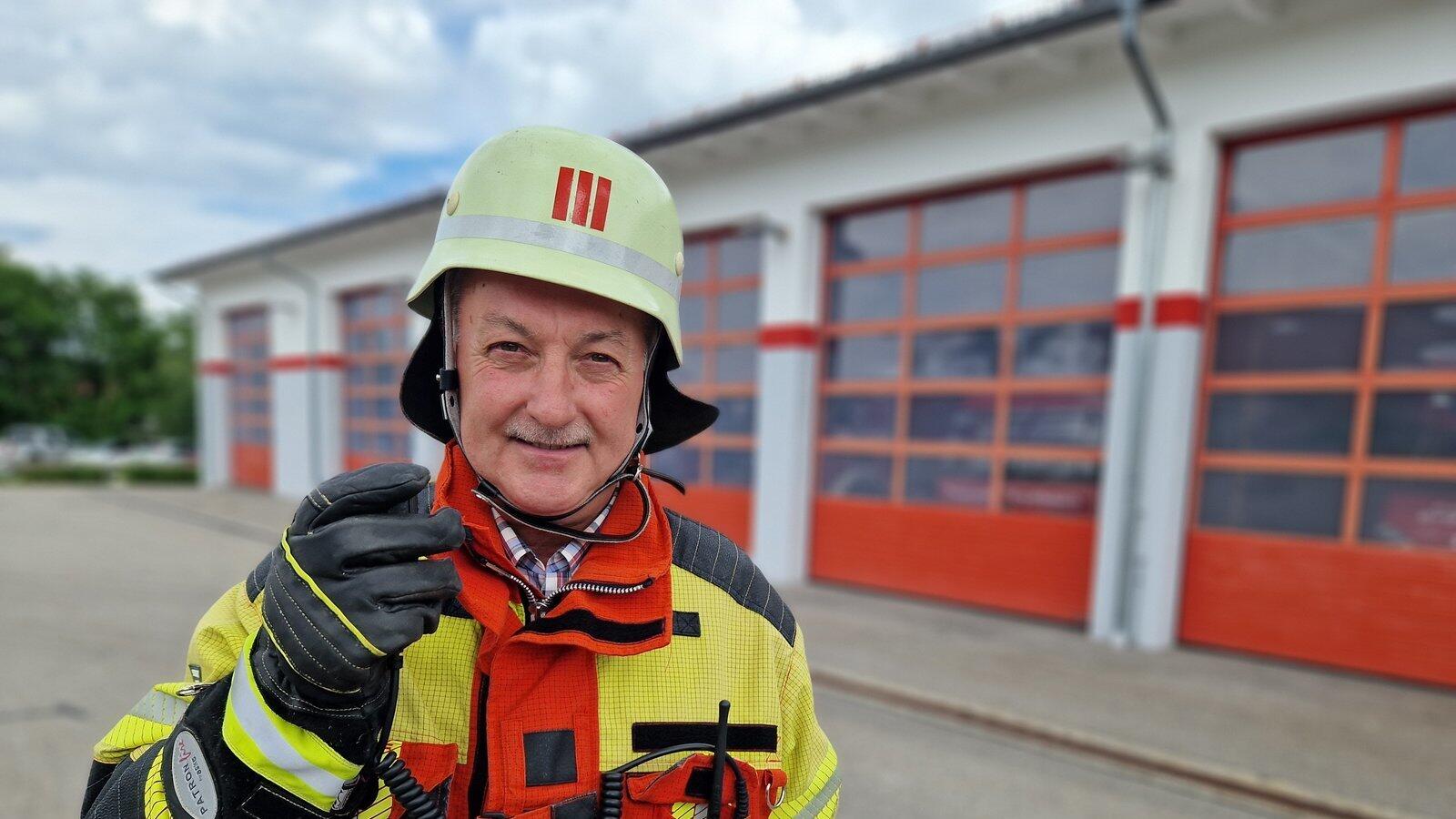 Kreisbrandinspektor Johann Haller. Für uns ist er nochmal in seine Einsatzkleidung geschlüpft. Am Samstag muss er sie abgeben. Es ist sein letzter Tag als Kreisbrandinspektor. Am Sonntag hat er Geburtstag. Dann wechselt er vom aktiven Dienst in den passiven, und wird weiter im Verein der Feuerwehr tätig sein.