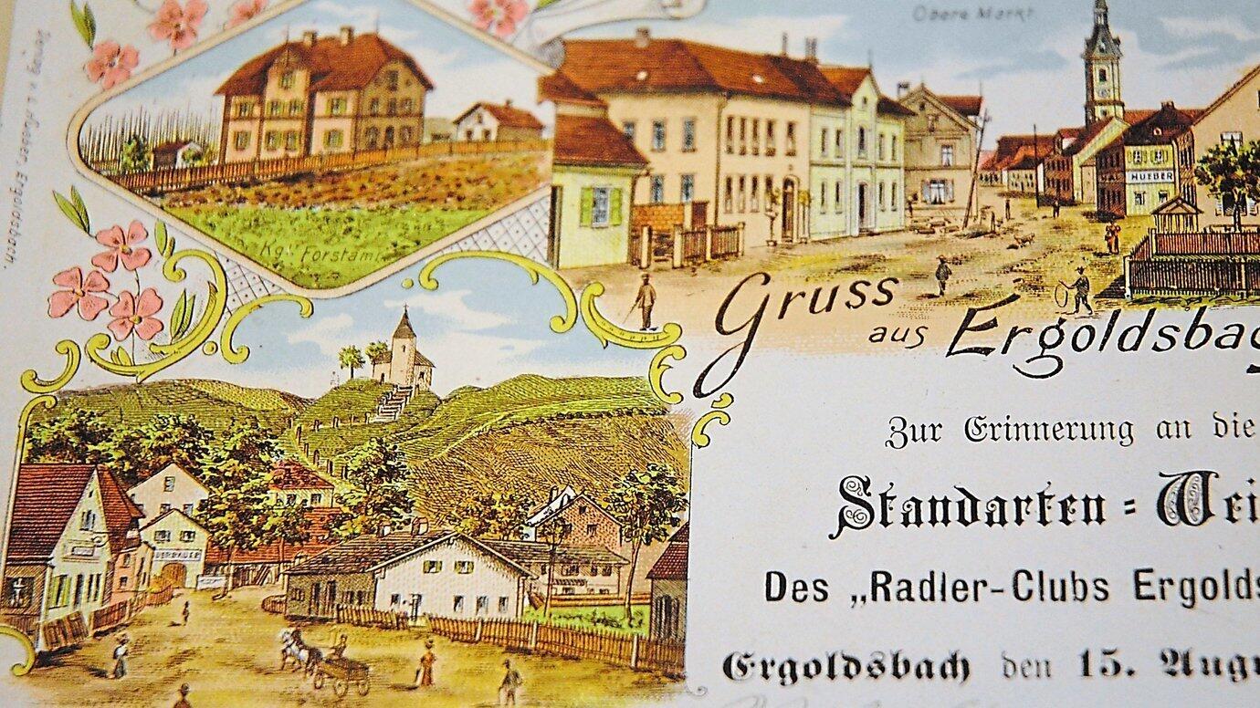 Die erste Ansichtskarte von Ergoldsbach stammt aus dem Jahr 1897. Das Motiv wurde für die Standarten-Weihe des damaligen Radler-Clubs verwendet.