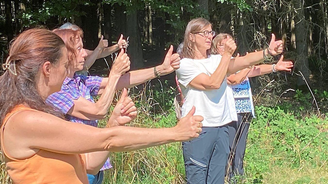 Ich greife nach unten in die Luft „schöpfe Kraft aus dem Boden“ und strecke die Arme Richtung Himmel, schaue hinauf in die Baumkronen. Hildegard Riedl sagt den Text zum „Sonnengruß“ einer Yoga-Figur.