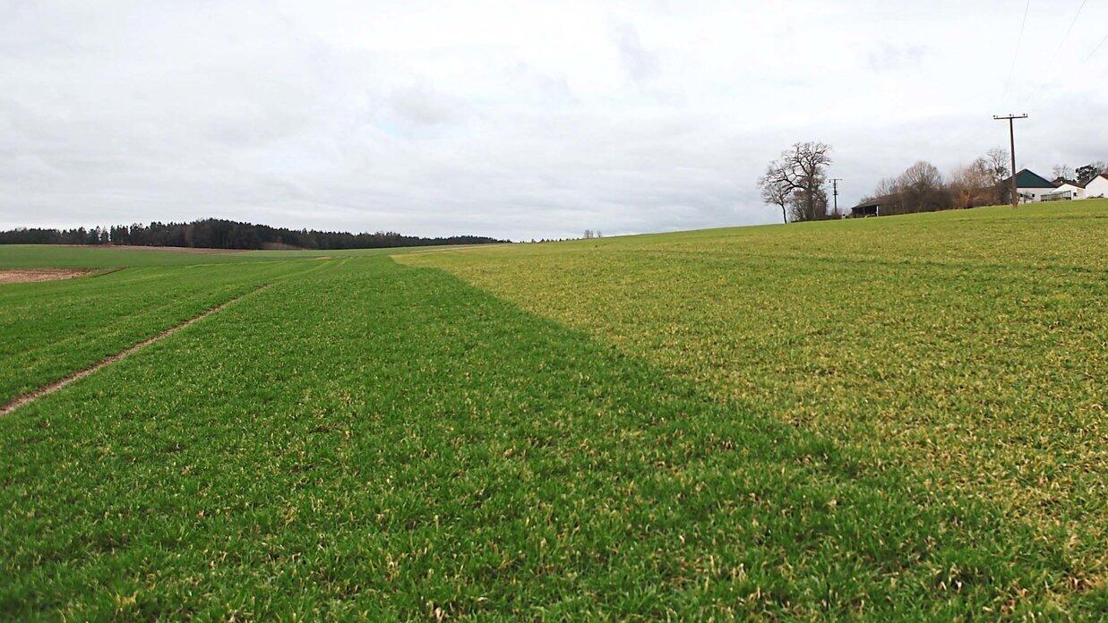 Der Unterschied zwischen dem gedüngten (links) und nicht gedüngten Wintergerstenschlag ist deutlich sichtbar. Im Hintergrund der landwirtschaftliche Betrieb von Landwirt Franz Vilser, der diesen Versuch durchgeführt hat.