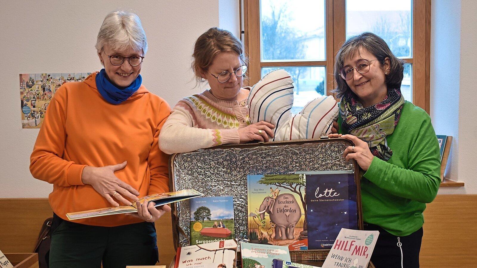 So sieht der „Trostkoffer“ aus. Dahinter in der Mitte Monika Obermeier vom Büchereiteam mit den Geldgebern Irmi Diewald (links) und Anja Feichtinger (rechts).