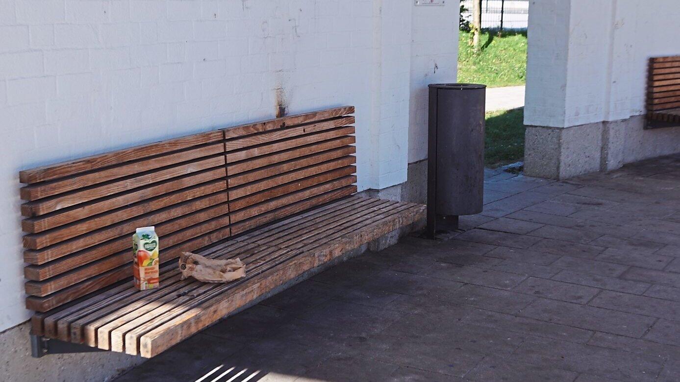 Kirchplatz Vilsbiburg: Immer wieder liegt auf den Arkaden-Bänken Müll. Nicht nur Grundschulhausmeister Stephan Anzinger stört es, dass die Müllbehälter oft beschmiert werden. Unter anderem ärgert er sich auch, wenn Glasscherben umherliegen.