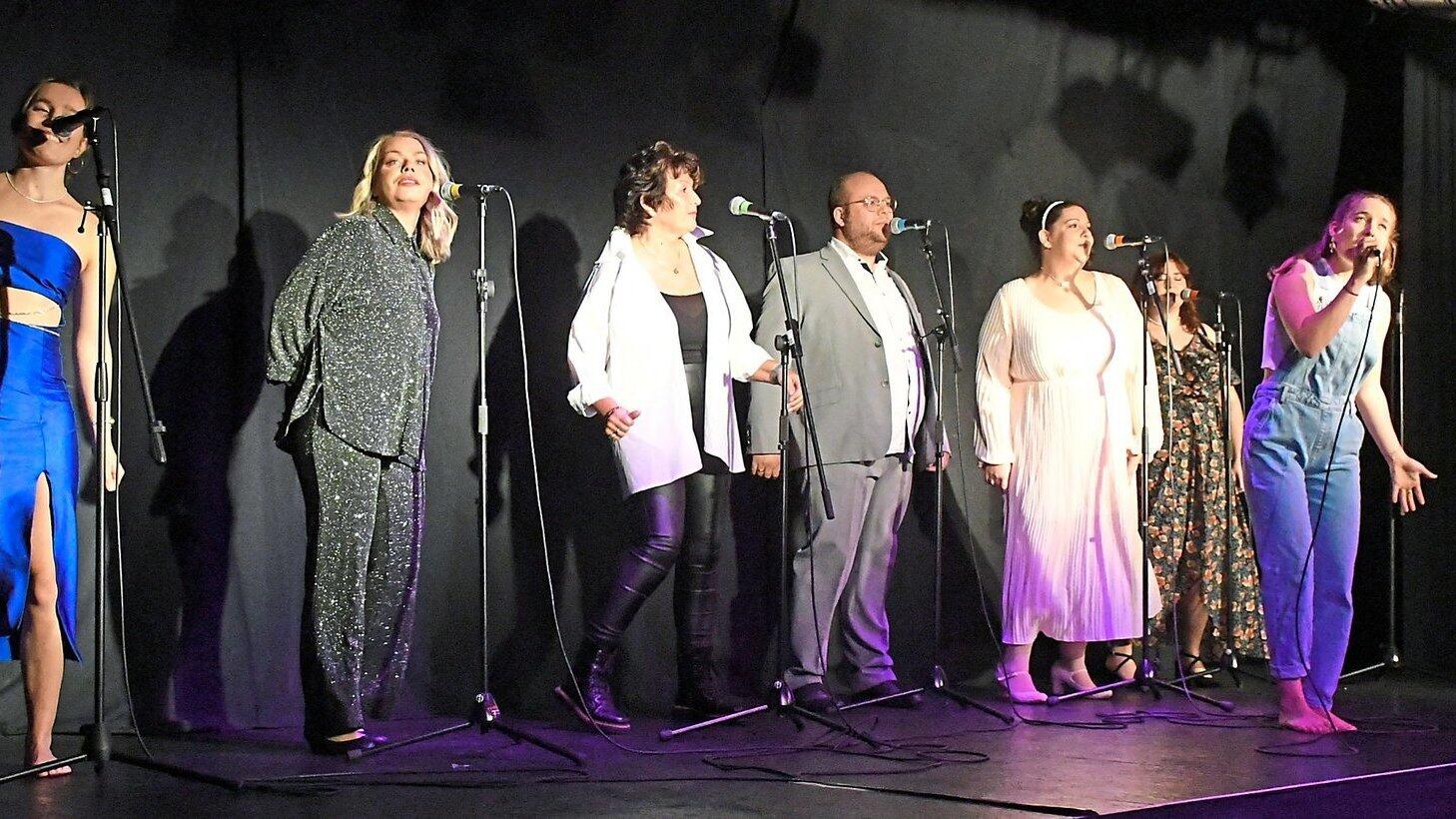Auch zwei Songs aus „Mamma Mia“ sind in der Musicalgala des Theaterbrettls zu hören (von links): Veronika Gröschl, Judith Täubert, Heidi Braun, Timm Mannott, Jennifer Hild, Julia Püschel und Anna Gröschl.