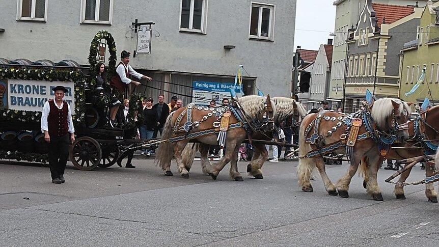Fahrerisches Geschick und eine gute Beherrschung der sechs Pferde im Gespann waren für den Prachtwagen der Brauerei Arco bei der Ausfahrt aus dem Stadtplatz in die Obere Stadt notwendig.