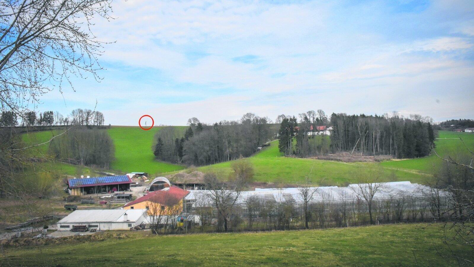 Die Gebäude im Vordergrund gehören zu den Höhenberger Werkstätten. Etwa 400 Meter weiter, auf einem Hügel (rote Markierung) soll ein 40 Meter hoher Funkmast errichtet und im Sommer in Betrieb genommen werden. Dagegen hat nun auch schon ein angrenzender Bauer geklagt.