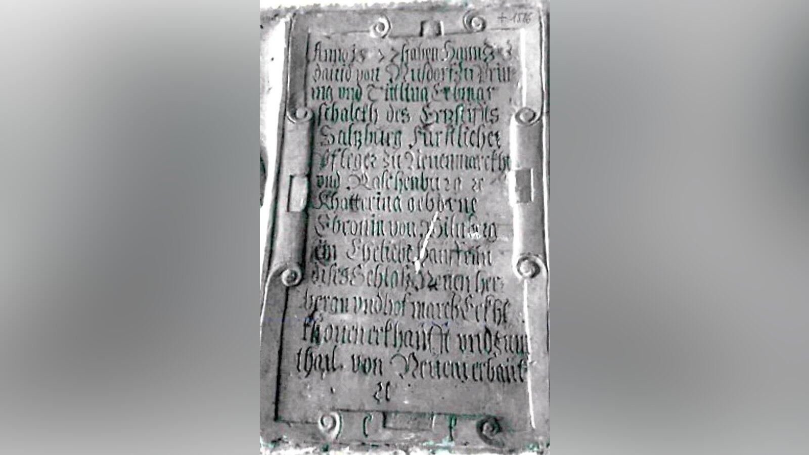 Inschriftentafel im Schloss Egglkofen über den Verkauf des Schlosses Neuenherberg am 26. September 1577 von den Adeligen der Königsfeld an Hans David von Nußdorf. Das Schloss gehört mittlerweile der Graf von Montgelas-Stiftung.
