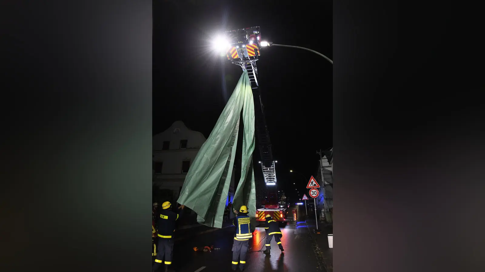 Einen weiteren, zeitaufwendigen und personalintensiven Einsatz hatten die Einsatzkräfte in der Nacht auf Sonntag an der Bergstraße. Während des Sturms hatte sich ein Blechdach auf einem Wohnhaus gelöst und drohte auf die Straße zu fallen. Nach Erkundung durch die Einsatzleitung der Vilsbiburger Feuerwehr entschied man sich, den Fachberater des Technischen Hilfswerk Ergolding an die Einsatzstelle zu rufen.