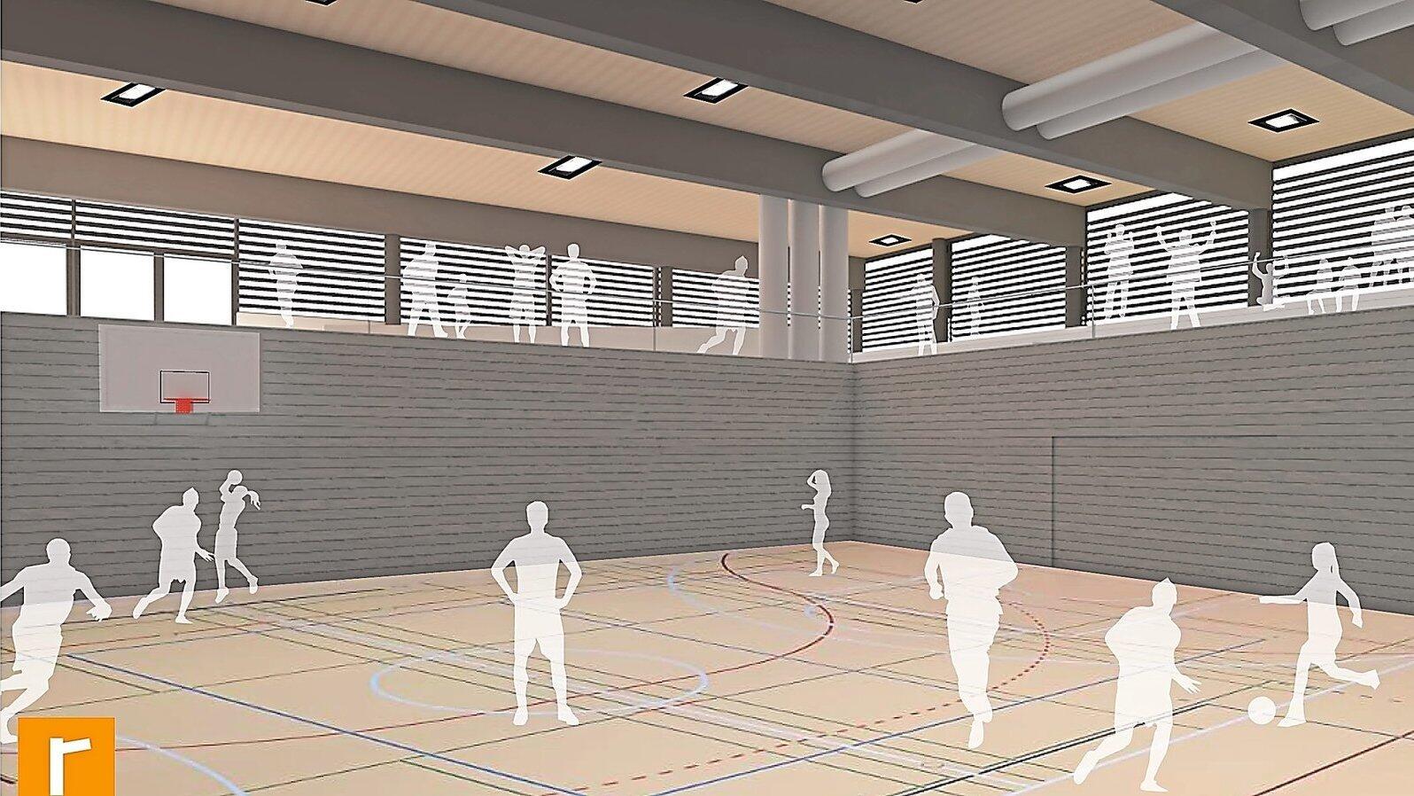 So soll die Sporthalle der Mittelschule nach ihrer Sanierung aussehen. Oben der Tribünenbereich mit der großzügigen Fensterfront, die mehr Tageslicht ins Innere lässt.