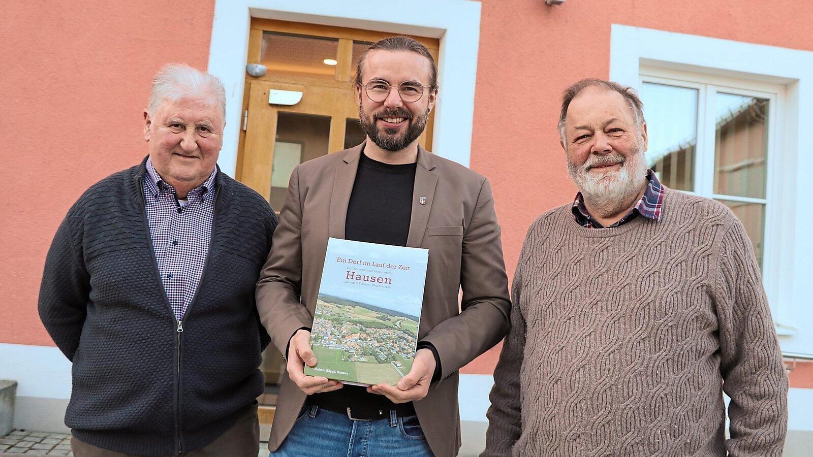 Helmut Köppl (v.r.), Bürgermeister Johannes Brunner und Josef Zachmeier präsentieren die 442 Seiten starke Chronik der Ortschaft Hausen.