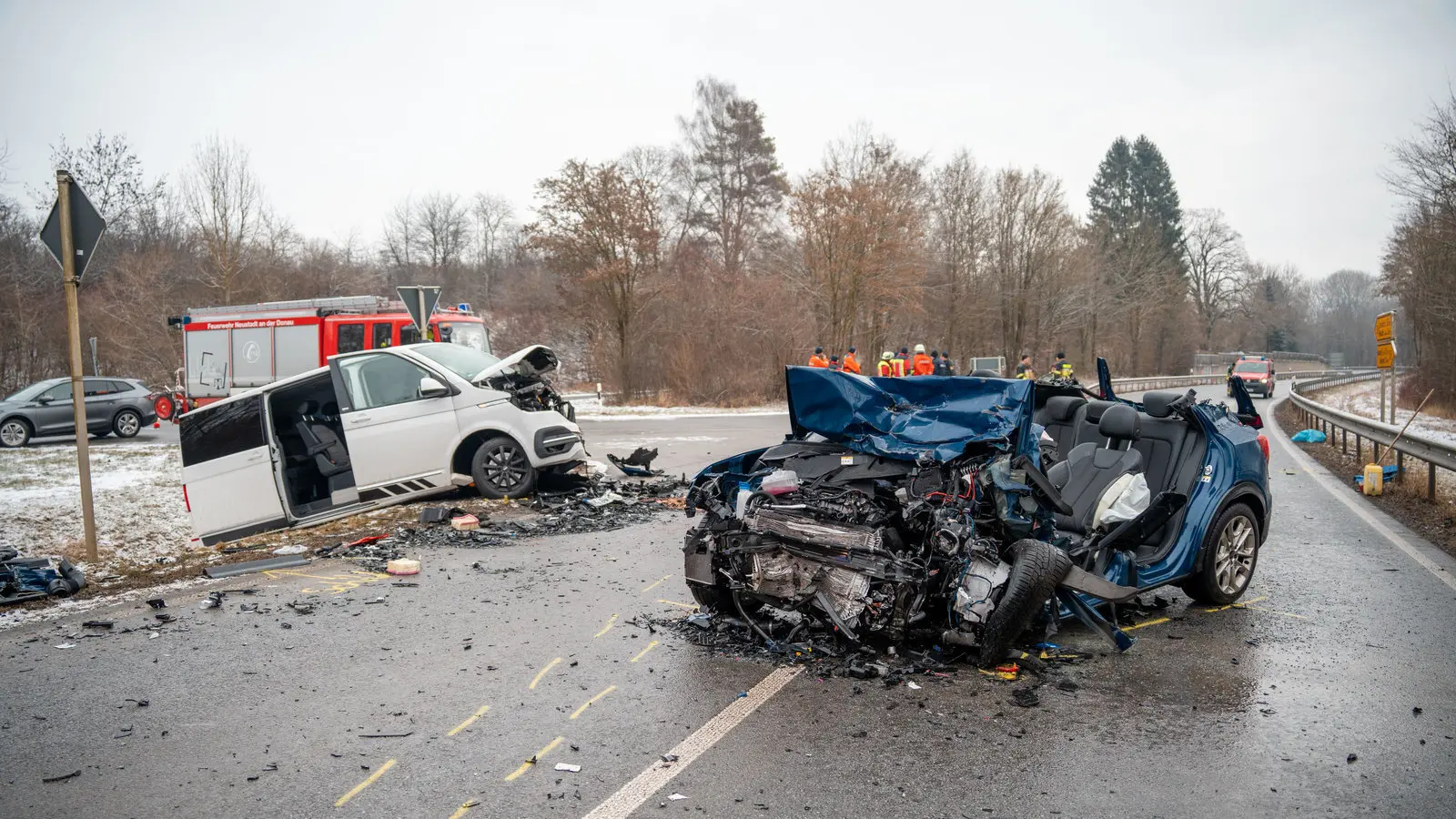Ein schwerer Verkehrsunfall ereignete sich am Donnerstag in den frühen Morgenstunden im Raum Neustadt an der Donau auf der B299. Laut Polizeibericht war gegen 6.20 Uhr auf der B299 ein 43-jähriger Audi-Fahrer in einer Kurve auf die Gegenfahrbahn geraten. Dort sei er mit einem entgegenkommenden Toyota zusammengestoßen.Anschließend kollidierte der Audi auch noch mit einem nachfolgenden Multivan.