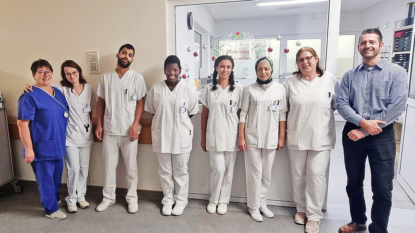 Auszubildende mit Ausbildern (v.l.): Gertrud Wagner, Praxisanleiterin Tanja Hölzl, Leiterin der Ausbildungsstation, die Auszubildenden, Sabine Massier, Praxisanleiterin und Geschäftsführer Christian Degen.