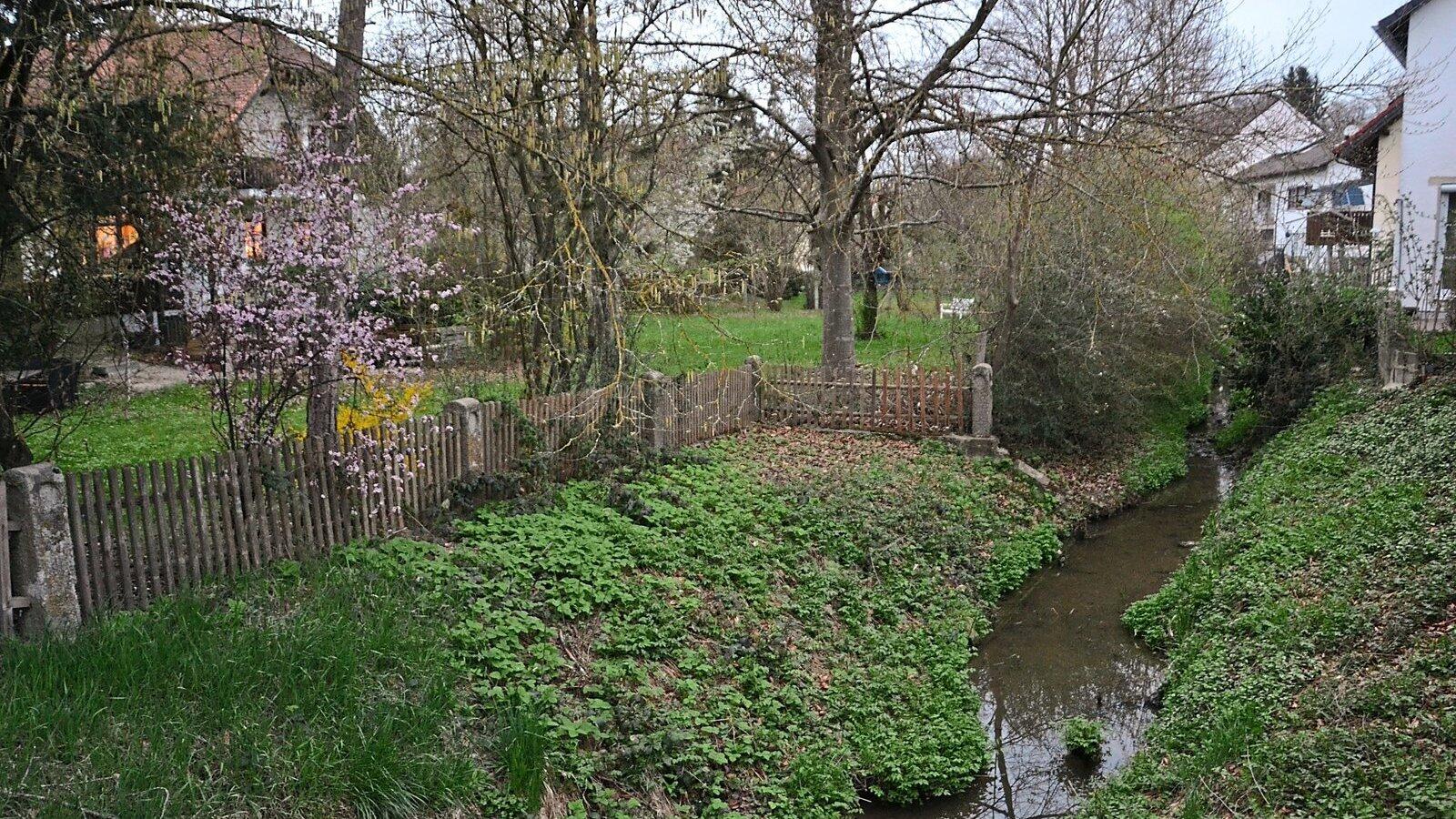 Bei starken Regenfällen verwandelt sich der Leitersdorfer Bach rasend schnell in einen reißenden Strom - und überschwemmt das Grundstück links im Bild. Genau dort soll der Parkplatz für eine Wohnanlage entstehen. Die Mitglieder des Bauausschusses warnen vor der Gefahr, die das Kreisbauamt offenbar nicht sehen will. Foto:
