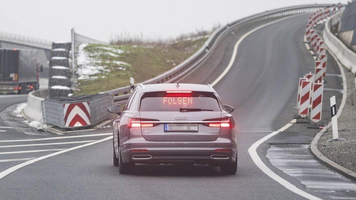 Eine Polizeikontrolle: Was sollen Verkehrsteilnehmer tun, wenn sie die rot leuchtende Schrift „Folgen“ im Fahrzeug vor sich sehen?