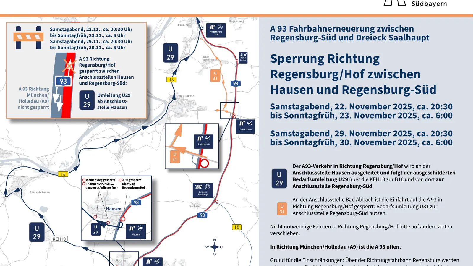 Wer von Bad Abbach kommt, folgt der Umleitung über die Staatsstraße 2143 zur Kreisstraße R4 und weiter zur Anschlussstelle Regensburg-Süd. Die A93 wird zwischen Regensburg-Süd und dem Dreieck Saalhaupt derzeit von Grund auf erneuert. Dabei werden Betonfahrbahnen durch Asphalt ersetzt, der Unterbau bis zu 1,5 Meter Tiefe bearbeitet und Entwässerungsleitungen erneuert. Noch bis Mitte Dezember wird der Verkehr beidseitig auf der Richtungsfahrbahn München geführt, wodurch nur drei Fahrstreifen zur Verfügung stehen -einer davon in Richtung Regensburg, zwei in Richtung München.