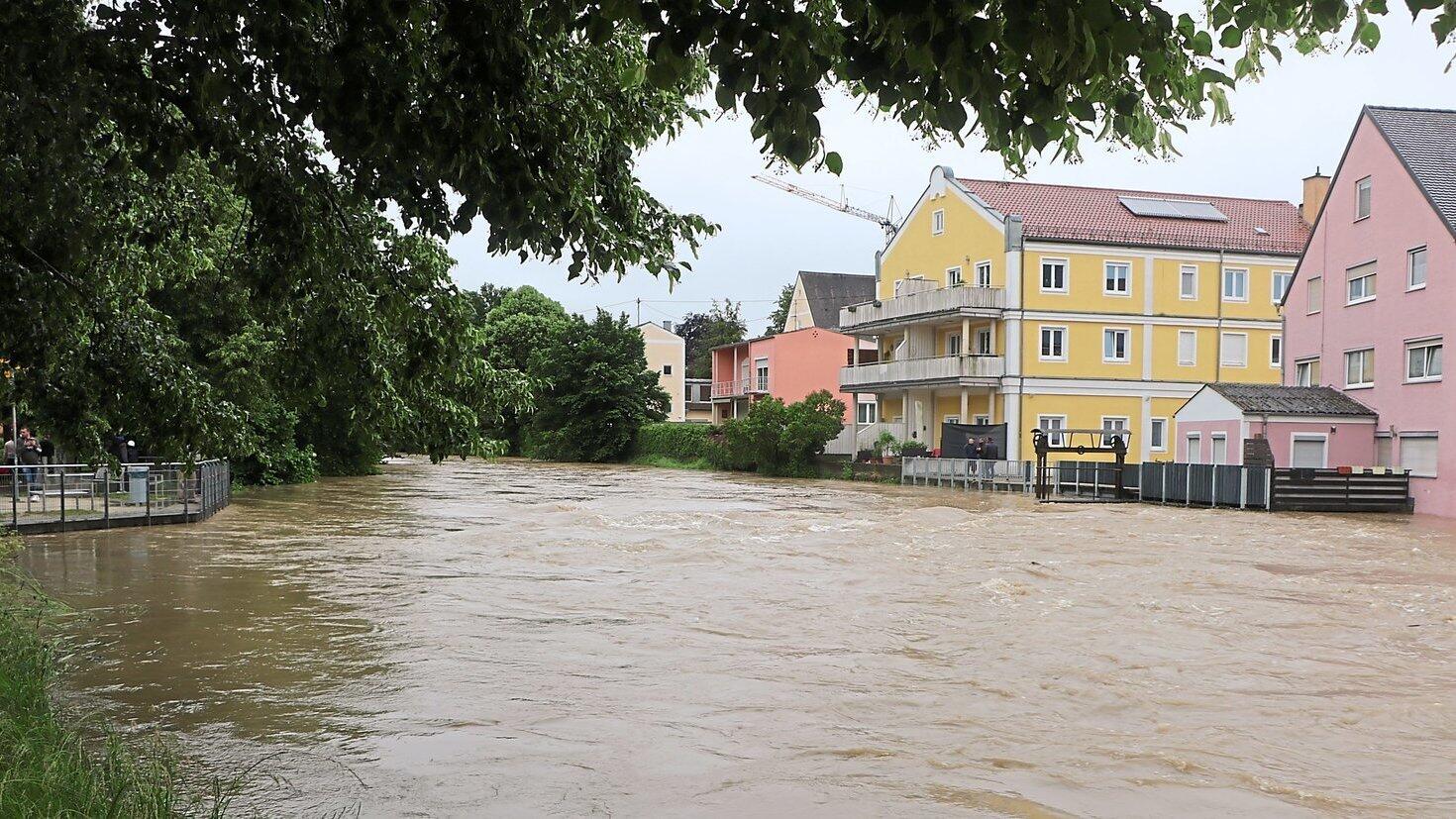 Höchstwert Pegel 2,84 Meter in Mainburg am Samstag, 1. Juni, um 17 Uhr. Es fehlte nicht mehr viel, dann wäre die Abens im Bereich Griesplatz über die Ufer getreten.