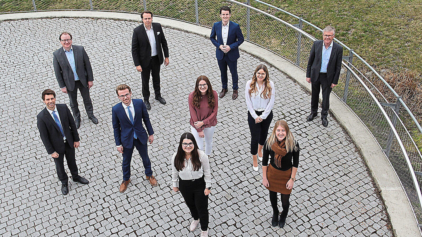 Stefanie Wimmer und Julia Bauer (vorne, v. l.), Johannes Kögl, David Holzmair, Julia Klement und Franziska Schober (Mitte, v. l.) sowie Martin Habel und Markus Hätscher mit den Raiffeisen-Vorständen Andreas Ehrmaier (rechts) und Florian Maier (hinten, links).