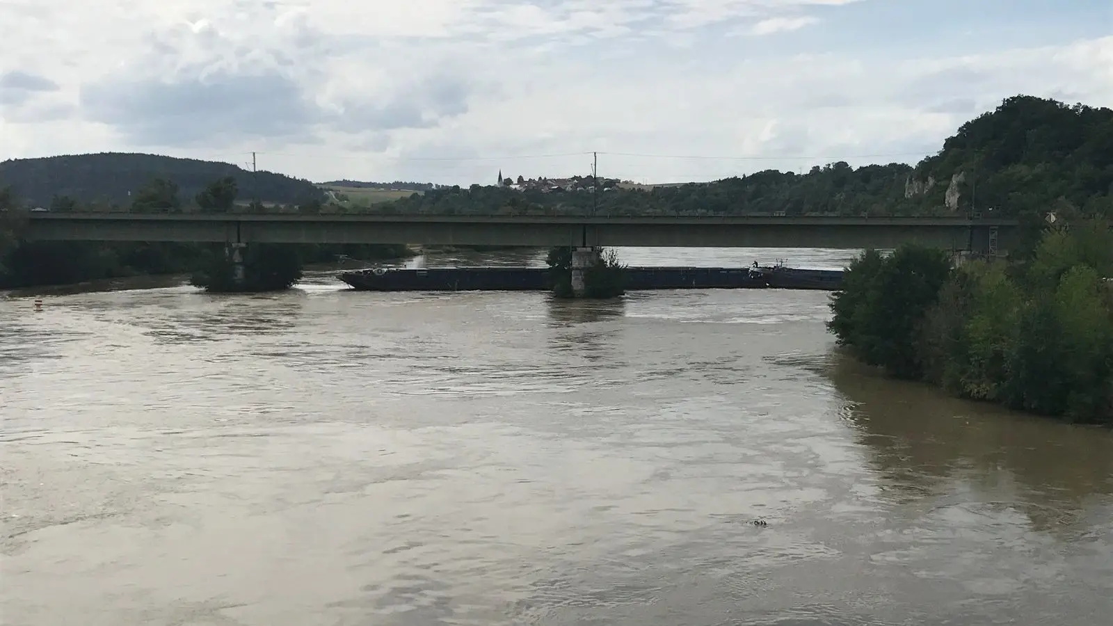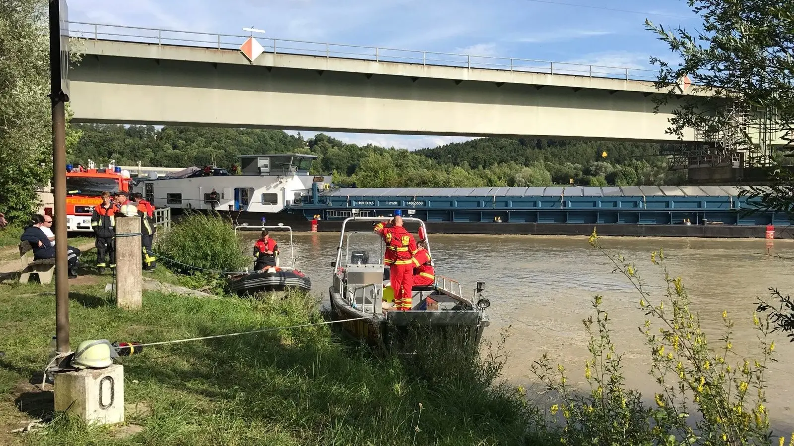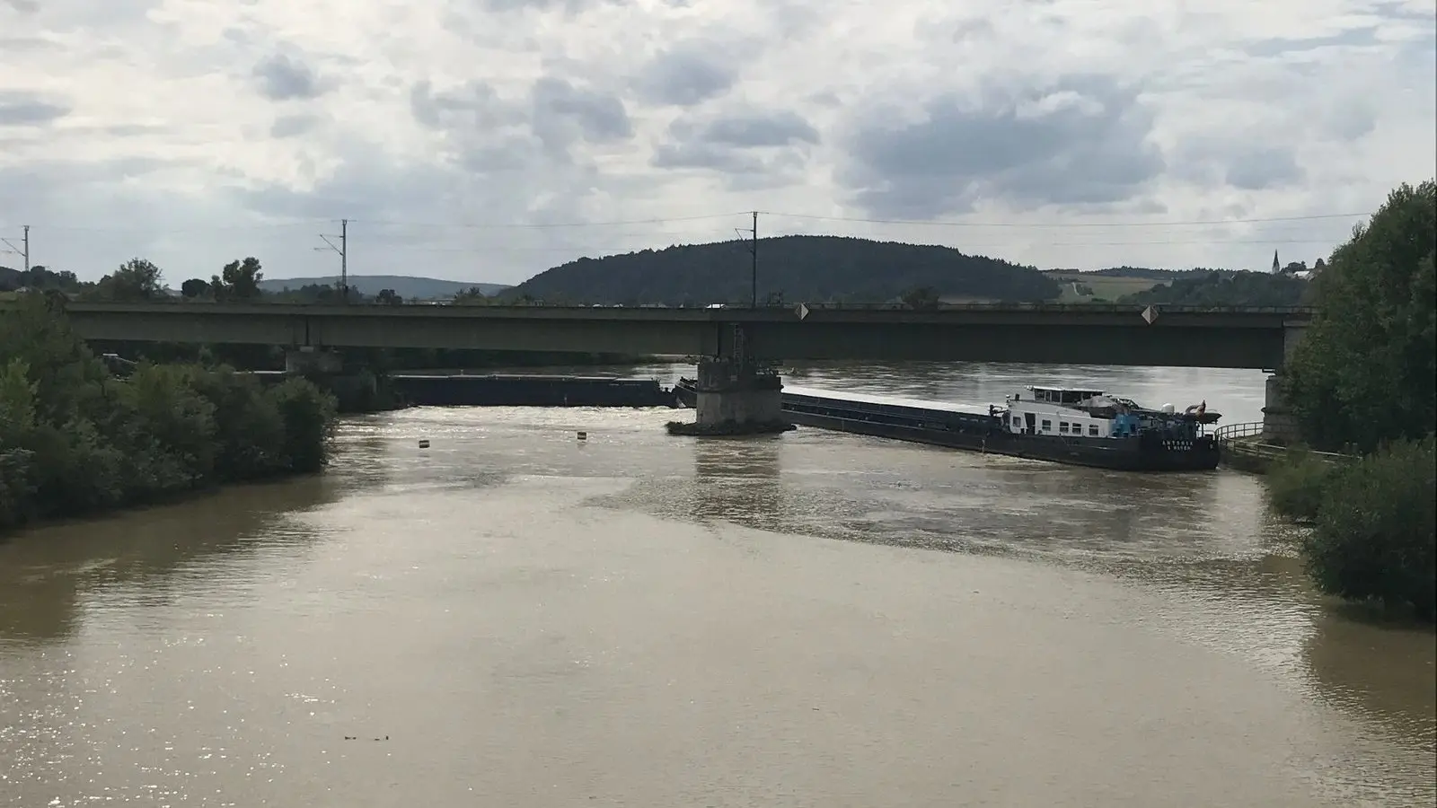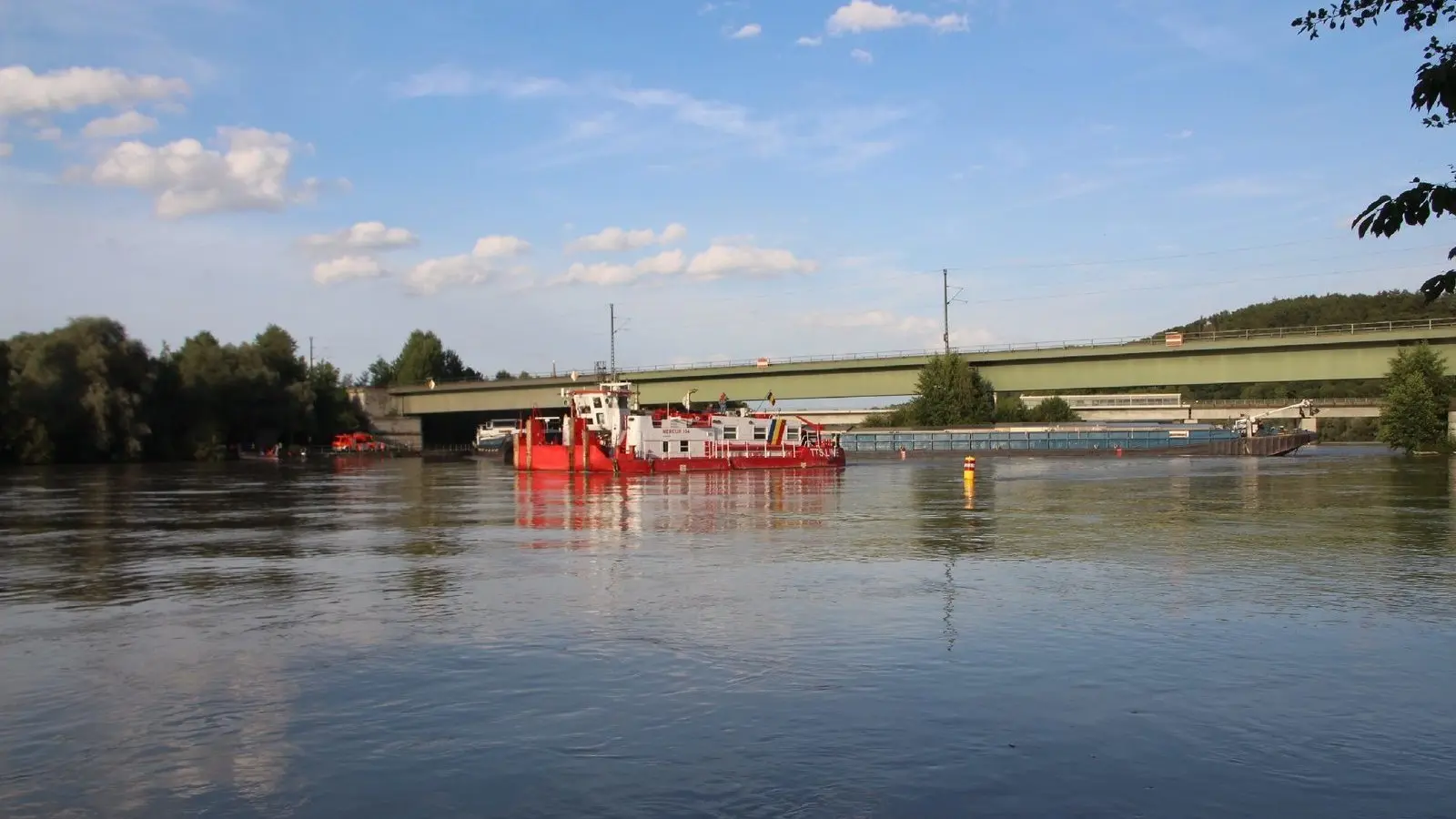 Gegen 16 Uhr hat sich bei Poikam auf der Donau ein Schiff quergestellt.