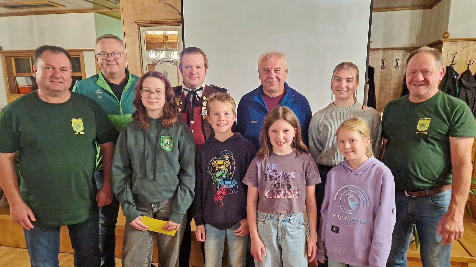 Die erstplatzierten Gewinner aus den zehn Disziplinen freuen sich über ihre sportlichen Erfolge und die Gewinne. Schützenmeister Ewald Socher (rechts) und Jürgen Schmelz (links) gratulieren.
