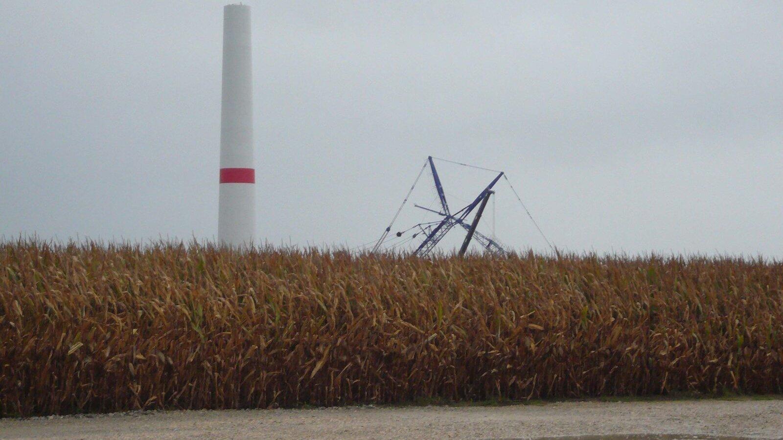 Hoch ragt der eine der beiden Türme aus dem Maisfeld. Der Kran daneben ist erst der kleine, der auf der Baustelle zum Einsatz kommen wird. Im April kommenden Jahres wird der große Kran aufgestellt.