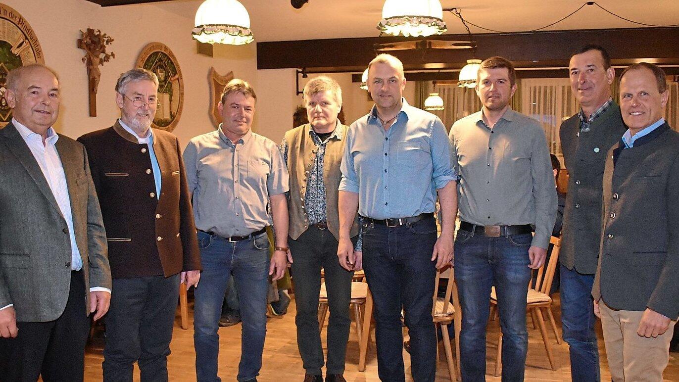 Die neue Vorstandschaft mit (v.r.) Leonhard Berger, Hubert Ertlmaier, Johannes Amberger, Gerhard Putz, Alois Hufnagel und Markus Zieglmaier sowie den verabschiedeten Anton Pfaller und Georg Huber.