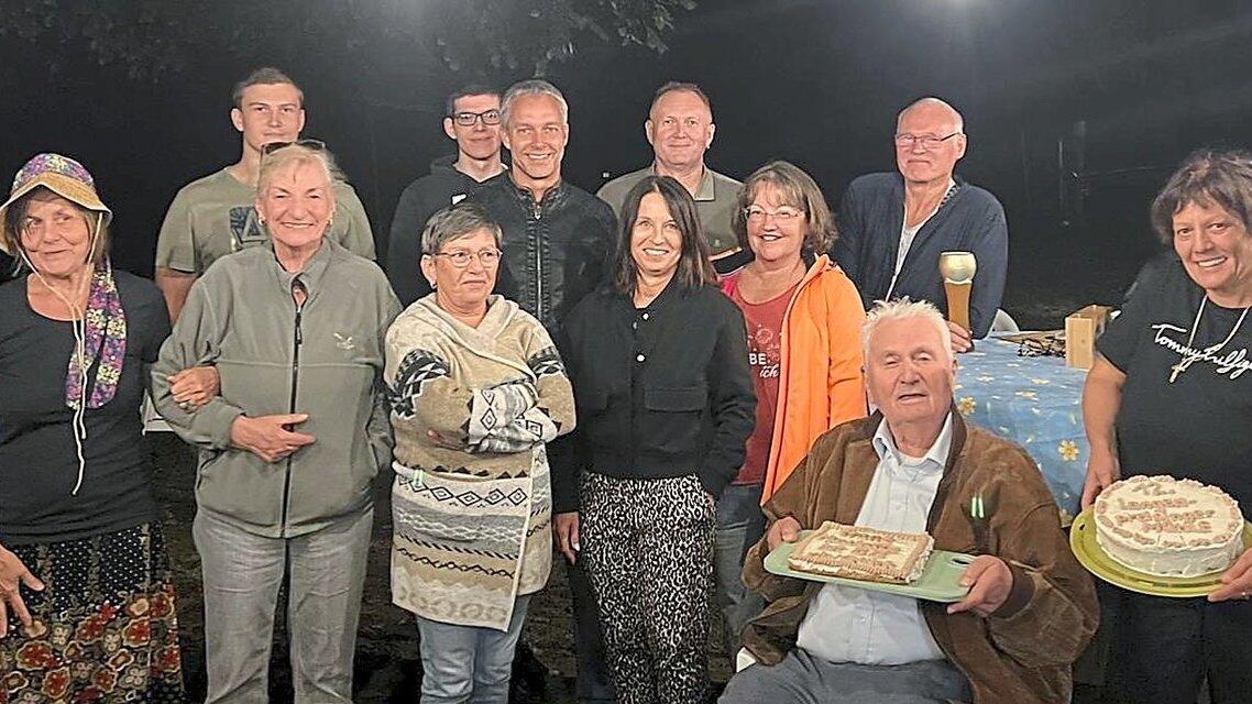 Die Teilnehmer der 12. Langenpreisinger Mühle-Meisterschaft mit Veranstalterin und Kioskbetreiberin Christa Daimer (mit Torte).