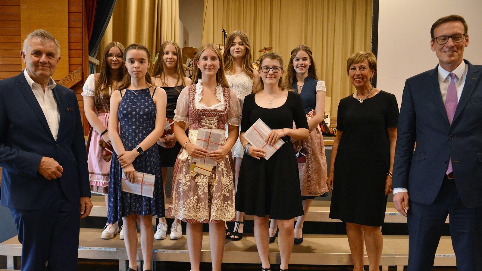 Die sieben besten Absolventinnen zusammen mit Bürgermeister Josef Dollinger (links) und Schulleiter Wolfgang Korn.