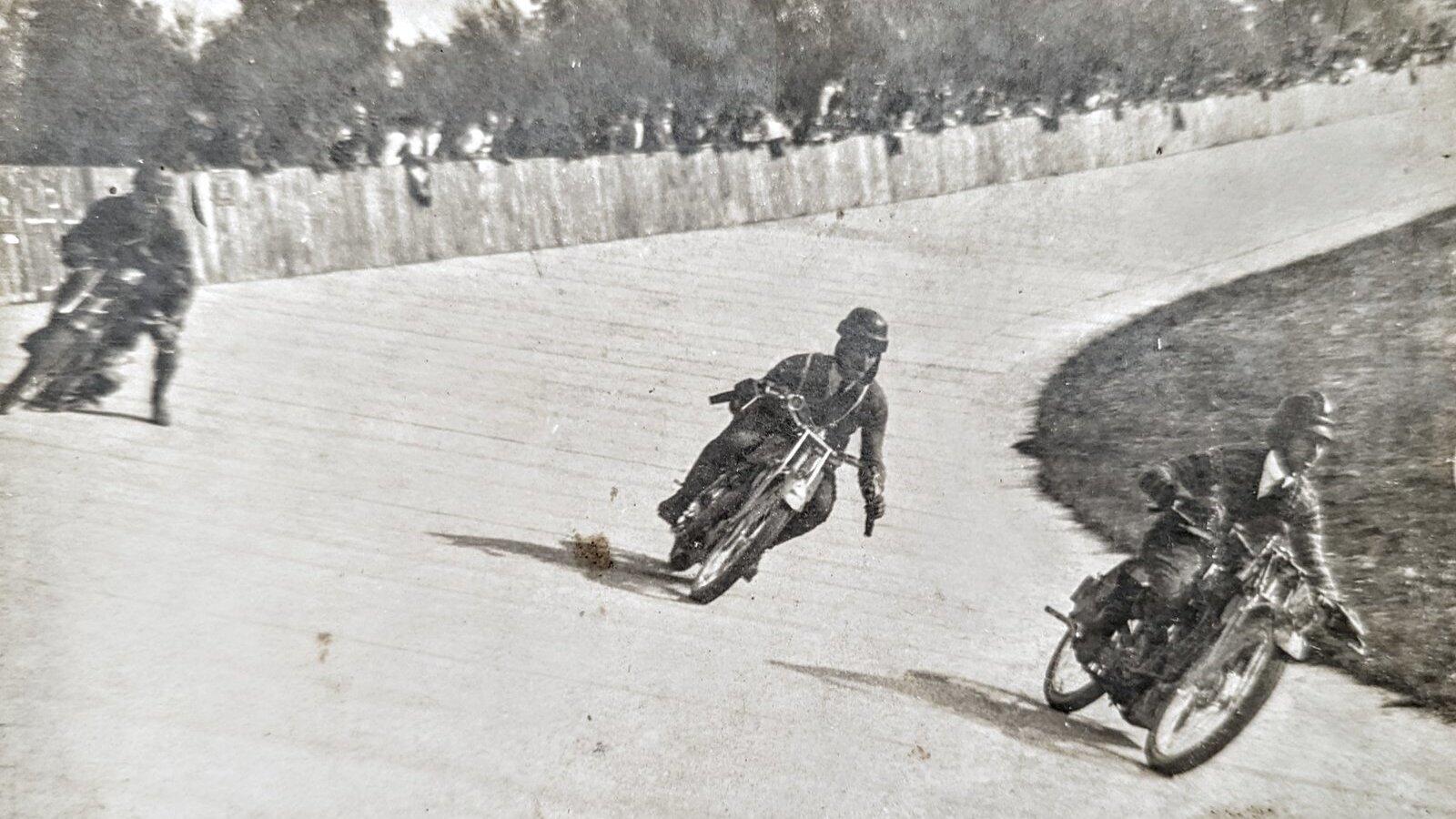Josef Schmid (vermutlich in der Mitte dieses Fotos) auf der Moosburger Concordia-Rennbahn im Jahr 1926 - die Aufnahme stammt aus einem Fotoalbum eines Vilsbiburgers.