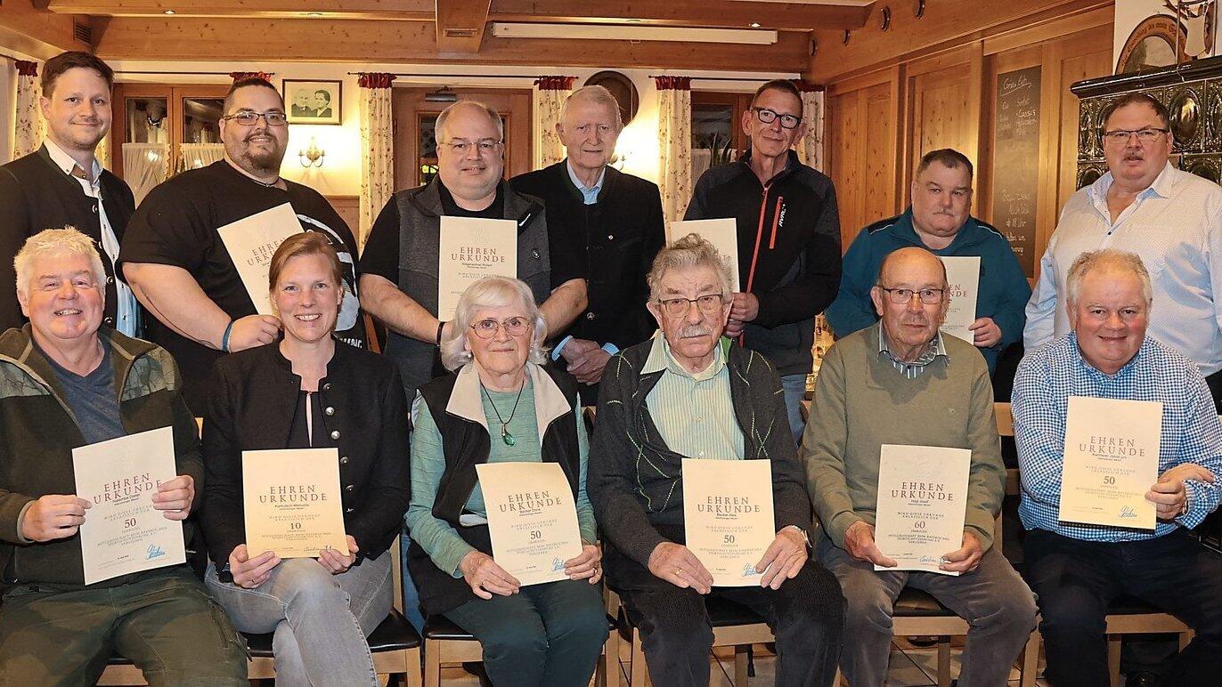 Gausportleiter Benedikt Flexeder (hinten l.) und Schützenmeister Josef Krojer (hinten r.) ehrten Christoph Scharlach, Robert Wagensohner, Karl-Heinz Schrafstetter, Klaus Manß, Andreas Dilger, (vorne v.l.) Dieter Halemba, Manuela Karkutsch, Doris Becker, Alex Becker, Josef Hagl und Jakob Kiermeier.