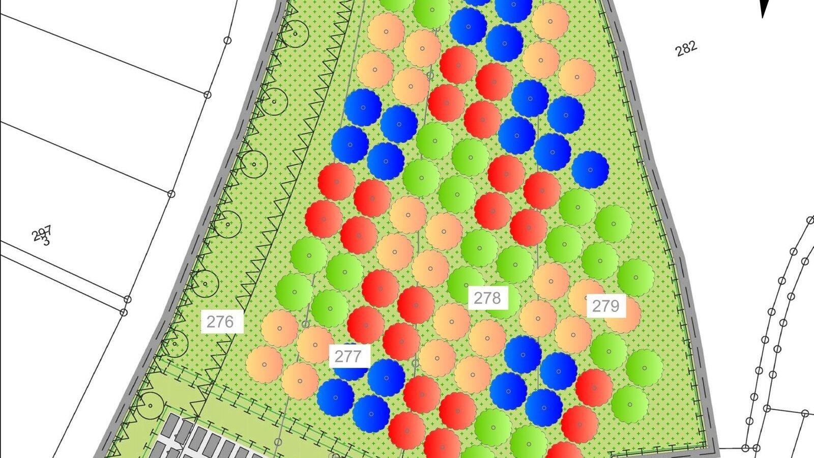 99 Obstbäume sollen auf der Streuobstwiese gepflanzt werden, alles alte heimische Sorten. Grün: 28 Birnen, rot: 24 Äpfel, blau: 22 Hauszwetschgen, gelb: 25 Mirabellen. Dazwischen und drumherum 14.725 Quadratmeter mageres extensives Grünland.