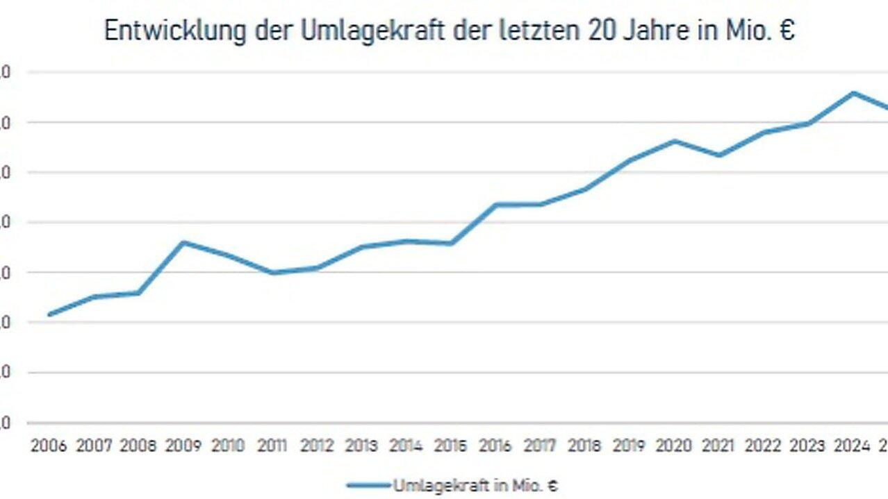 Die gegenüber dem Vorjahr um rund 5,7 Prozent gesunkene Umlagekraft spiegelt hauptsächlich die Entwicklung der Steuerkraft wider, die vor allem durch den Gemeindeanteil an der Einkommenssteuer und die Gewerbesteuer beeinflusst wird.