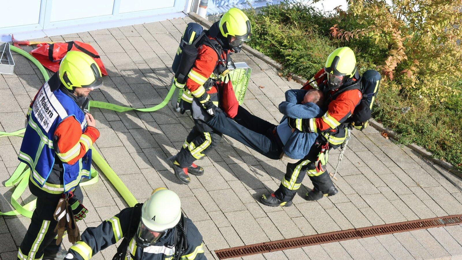 Verletzte wurden von den Atemschutzgeräteträgern aus dem verrauchten Schulgebäude getragen.