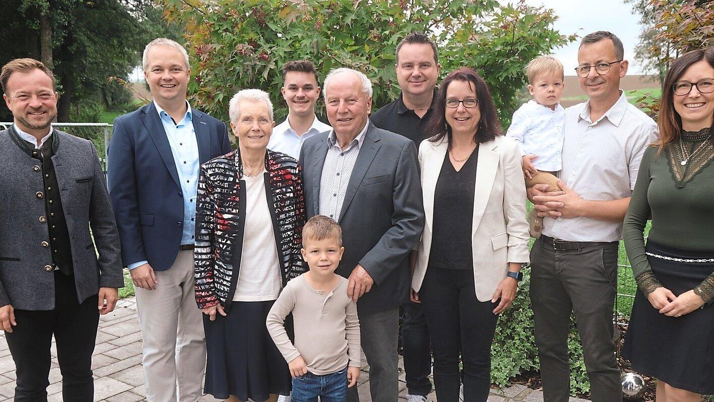 Jubilar Josef Lachner mit Gattin Rosina (Bildmitte), den Kinder Martin, Richard und Andrea mit ihren Lebenspartnern, den drei Enkeln Maximilian, Benedikt und Valentin und Bürgermeister Stefan Haberl.