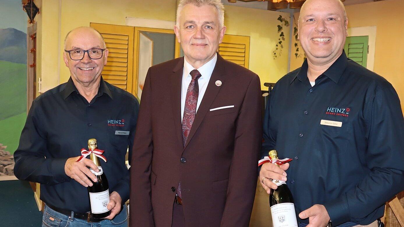 Heinrich Heinz (li.) bei der Geschäftsübergabe an Sebastian Selke (re.), Bürgermeister Dollinger wünschte beiden alles Gute für die Zukunft.