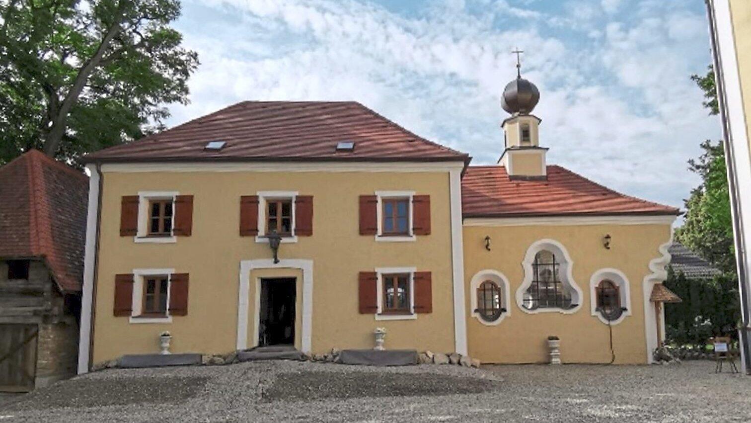 Die Außenansicht des Herrenhauses und der wieder errichteten Schlosskapelle Haag.