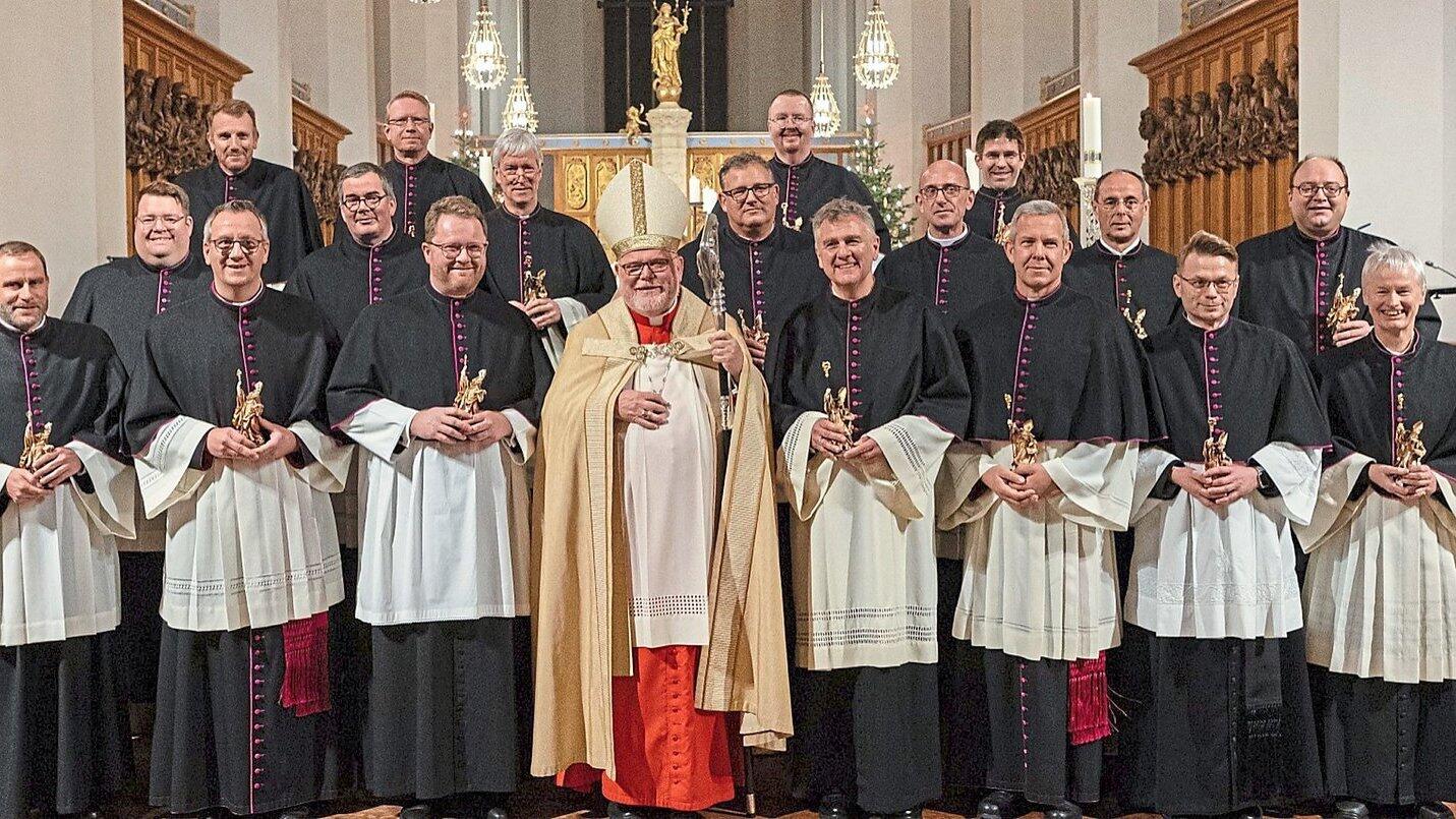 Kardinal Reinhard Marx mit den 18 neuen Dekanen des Erzbistums München und Freising, darunter Thomas Neuberger (mittlere Reihe links), der Freisinger Landkreisdekan Daniel Reichel (vordere Reihe 2v.l.), Peter Dietz (obere Reihe 2.v.l.) und Engelbert Dirnberger (vordere Reihe 3.v.r.).