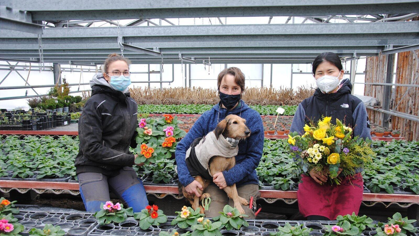 Trotz Ladenschließung ist das Team der Mühlbachgärtnerei fleißig. Im Bild zu sehen sind die Gärtnermeisterin Sandra Osterloher (Mitte) mit Gärtnerei-Hündin Babu und die beiden Auszubildenden Sophie Linseisen (l.) und Akari Takeda.