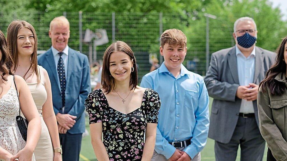 Ehrung der Jahrgangsbesten (v. l.): Lea Waser, Nejra Kulaglic, Schulleiter OStD Gerd Preuß, Joana Coman, Luca Werlik, Erich Irlstorfer MdB, Melisa Özege und Josef Wiesbeck.