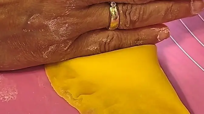 Für den Teig Mehl und 200 g Butter vermengen. Die Eier trennen und danach drei Eigelb, Schmand und eine Prise Salz zugeben und daraus einen Teig herstellen. Diesen eine Stunde kühl stellen. Als Unterlage empfiehlt sich ein mit Frischhaltefolie überzogenes, großes Brett.