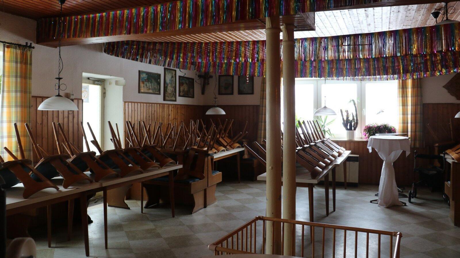 Bunte Girlanden hängen von den Wänden, auf der Theke liegen zwei Geldbeutel zum Kassieren. Überbleibsel einer rauschenden Ballnacht am Samstag im Festsaal des Gasthauses Krinner in Oberschneiding.