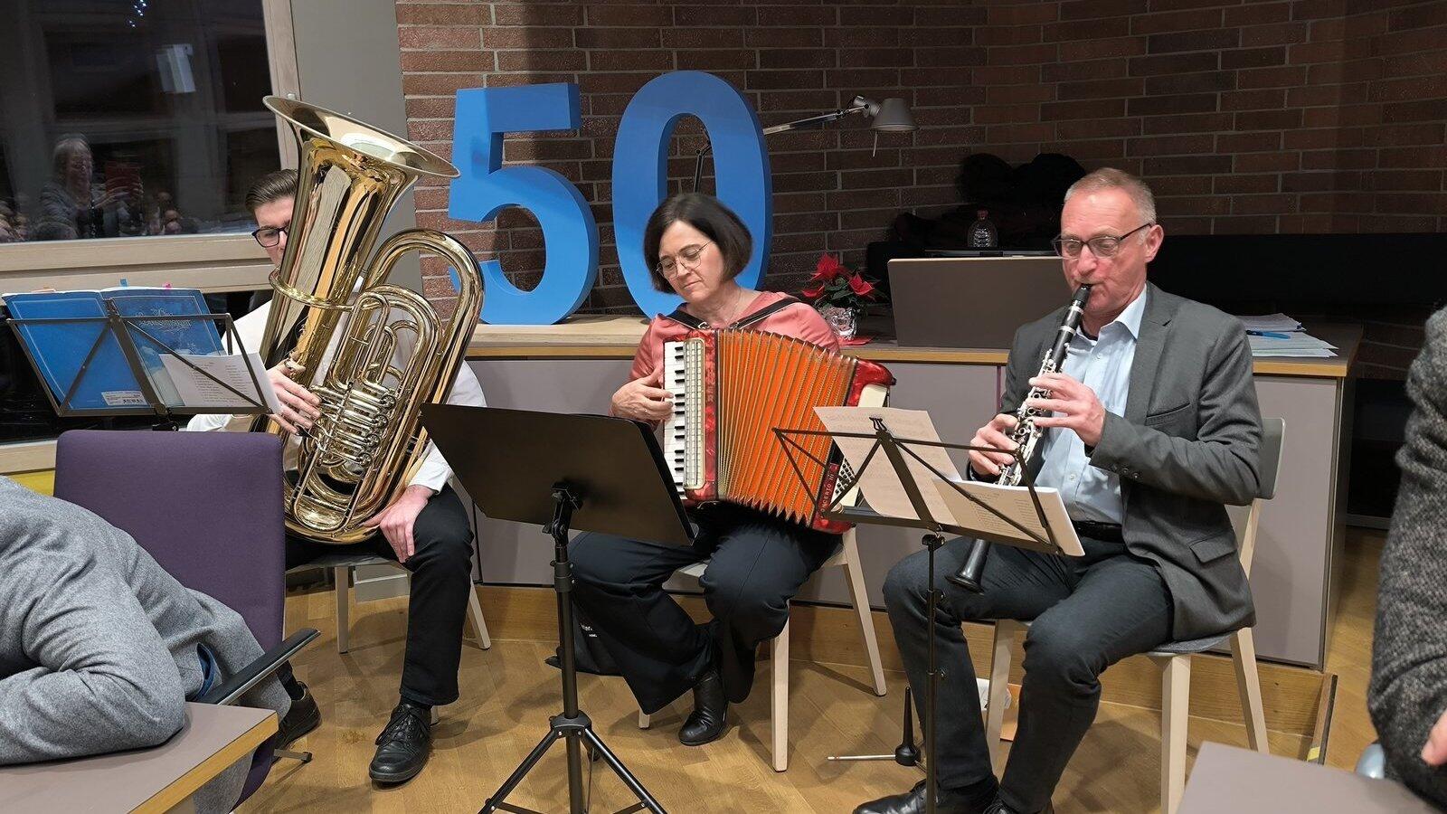 Andreas Friedländer an der Klarinette, Andrea Karl-Brandl am Akkordeon und Timo Blicke an der Tuba (von rechts) spielten einige Male auf.