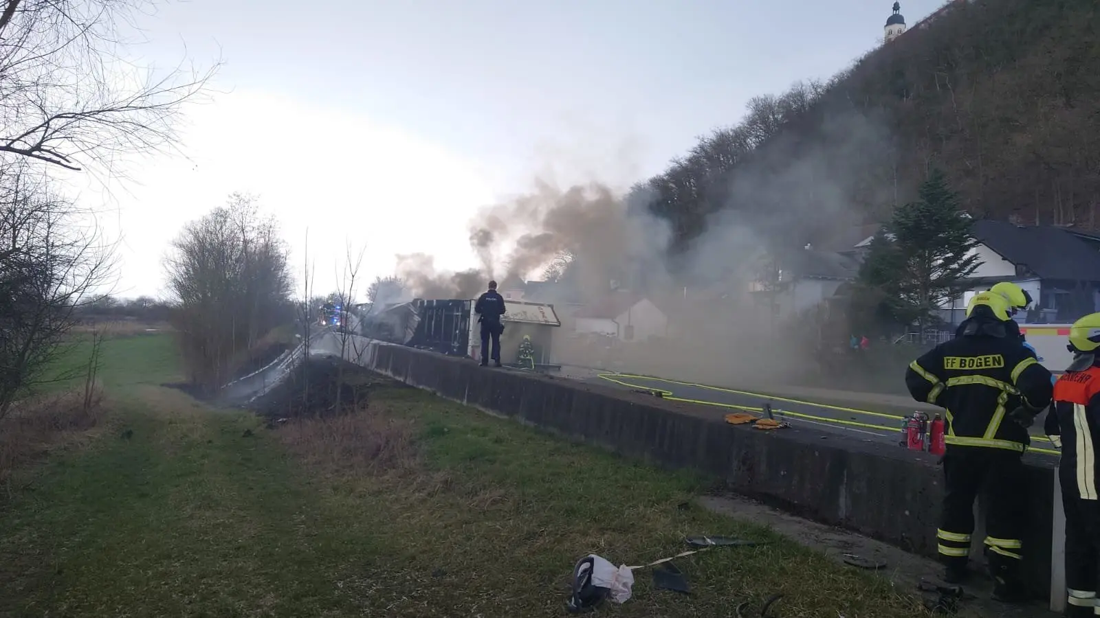 Nach dem Unfall am Mittwoch war die Straße bereits bis Donnerstagabend für den Verkehr gesperrt, da die Bergung des bei dem Unfall ausgebrannten Lastwagens sehr aufwendig war. Die Mitarbeiter der Straßenmeisterei Straubing arbeiteten mit den Einsatzkräften von Feuerwehr, Polizei und Abschleppdienst Hand in Hand, um die Straße wieder für den Verkehr freigeben zu können. Sie lösten die Feuerwehr bei der Vollsperrung der Straße ab, unterstützten das Bergeunternehmen bei der Reinigung der Straße und organisierten die Ölspurreinigung. Daneben beauftragten sie den Aushub des kontaminierten Erdreichs und bauten neues Bankettmaterial ein. Am Donnerstag gegen 17 Uhr konnte die Straße wieder freigegeben werden - womit für die Mitarbeiter der Straßenmeisterei ein 24-stündiger Einsatz endete.