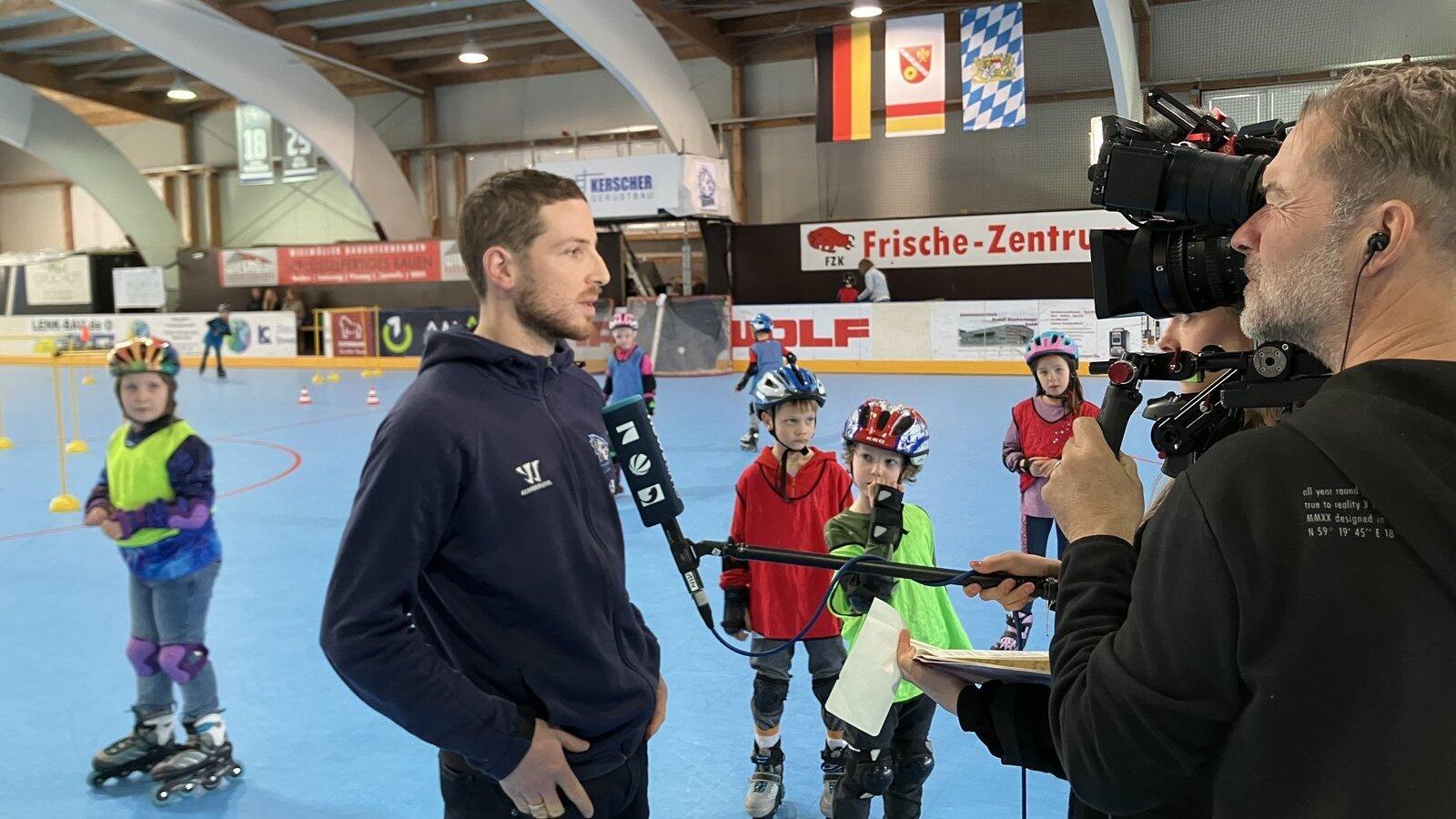 Neugierig fahren die Kinder um Fabian Hillmeier herum. Der Trainer und Bundesligaspieler wird genauso interviewt wie später einige Kinder und Eltern selbst.
