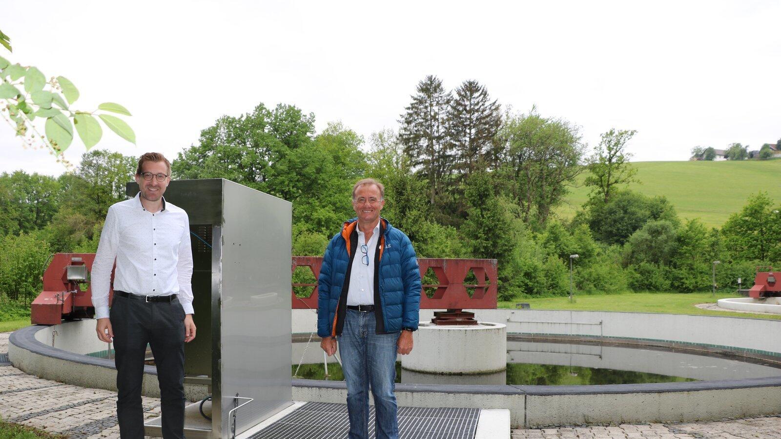 Bürgermeister Geog Edbauer (l.) und Hans Buchmeier, Bereichsleiter bei der Straubinger Stadtentwässerung, stehen auf dem Gelände der Schwarzacher Kläranlage. Nicht immer sind sie dort so gut gelaunt wie auf dem Bild, denn im Klo entsorgte Feuchttücher bereiten vielfach Probleme.