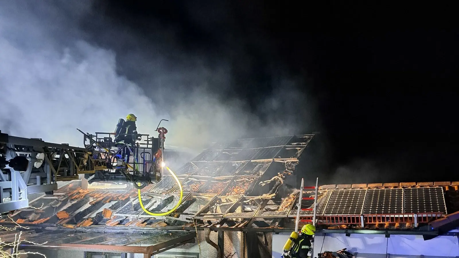 Für eine stabile Wasserversorgung wurden mehrere Hydranten im Umkreis in Betrieb genommen. Eine montierte Photovoltaikanlage erschwerte die Löscharbeiten in der Anfangsphase. Nachdem das erste Feuer grob abgelöscht worden war, ging es an die aufwendigen Nachlöscharbeiten und das Auffinden versteckter Glutnester. Hierzu wurde von beiden Drehleiter die Photovoltaikanlage und die darunterliegende Dachhaut geöffnet. Immer wieder flammte es auf und dichter Rauch quoll aus dem offenen Dachstuhl.