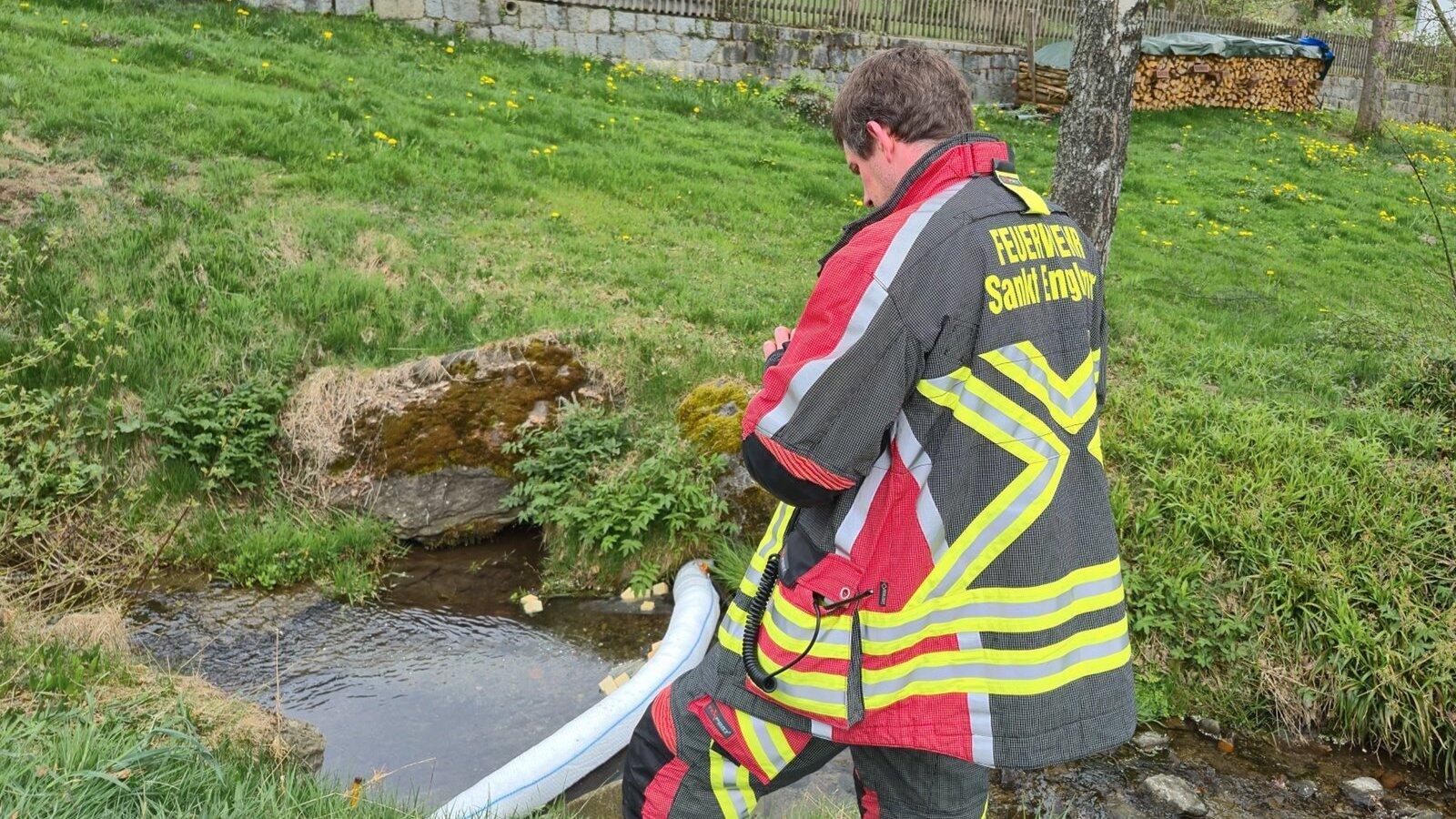 Ein Feuerwehrmann steht am Dorfbach neben der Ölsperre, die eine Ausbreitung der Verunreinigung verhindert.